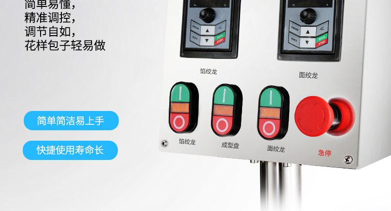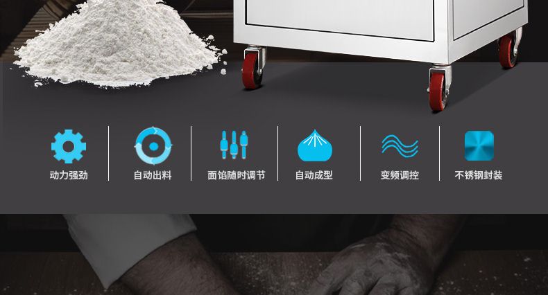 ◆ 本機采用雙絞龍送面、變頻無級調(diào)速,包子大小、出面出餡均可任意調(diào)節(jié),出面均勻、出面暢通、不傷面筋、不斷面筋,出餡系統(tǒng)優(yōu)點:餡管不會掉餡,不會出現(xiàn)空包子,出餡速度快,壓力小,均勻,適合各種不同的餡料。解決了普通包子機菜餡走不穩(wěn)的問題。