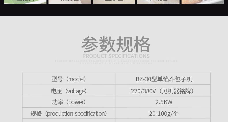 名稱BZ-30型單餡斗包子機 電源220/380V(見機器名牌) 功率2.5kw 產(chǎn)量1800個/小時 尺寸1440*680*1470mm 重量300kg 規(guī)格25-100克/個 其他