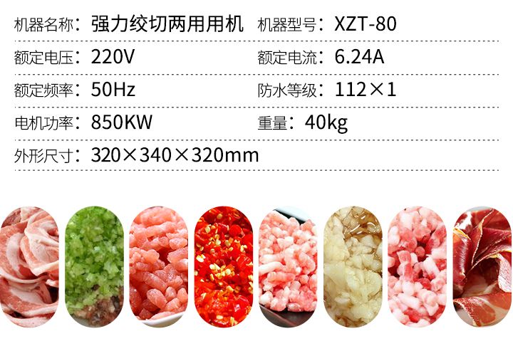 名稱XZT-80絞切機(jī) 電源220V 功率850/1100W 產(chǎn)量250kg/h 尺寸320×360×320mm 重量45kg 規(guī)格 其他