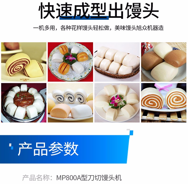 旭眾MP800A型刀切饅頭機(jī)采用高品質(zhì)微電腦控制,人性化的控制面板,控制準(zhǔn)確可靠,操作簡(jiǎn)單,可生產(chǎn)各種刀切饅頭、花卷等面食產(chǎn)品。