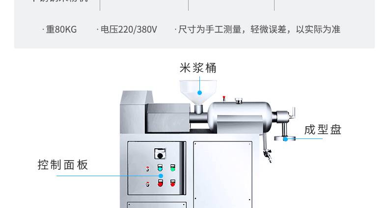 改進型不銹鋼米粉、米線專用機,裝有自動溫空裝置,整個生產(chǎn)過程設(shè)備均在恒溫狀態(tài)下運行,自動化程度高,操作簡單,l人即可生產(chǎn)??缮a(chǎn)米粉、米線、桂林米粉、過橋米線、年糕、糍粑等產(chǎn)品。各種形狀都可生產(chǎn)(圓、扁),加工食品外表光滑,厚薄、寬窄、粗細均勻可調(diào),筋軟適度,有彈性,口感柔軟、味道純正。