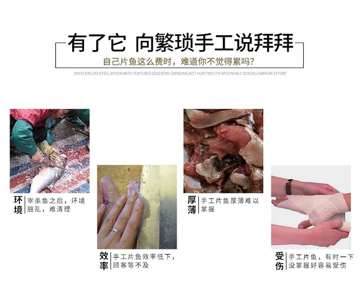 1、魚片斜切一次成型,可加工大、中、小各種鮮魚。