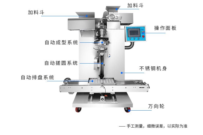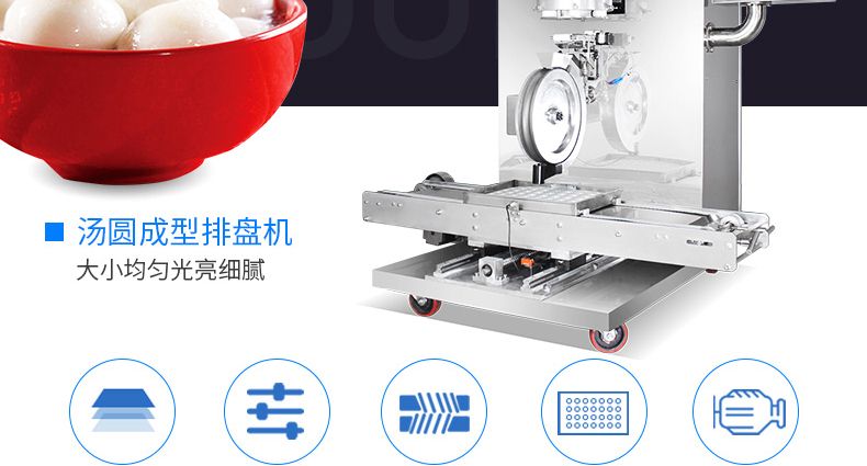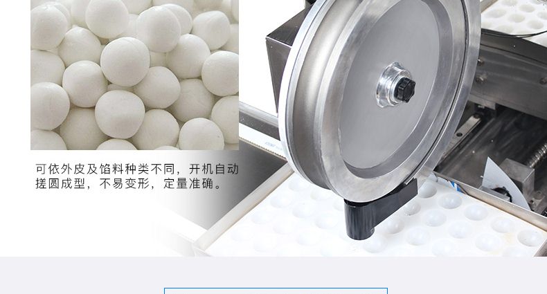 ◆自動化程度高,只要將面團與餡料放入進料口,開機便可自動搓圓成型,制品不易變形,定量準確;