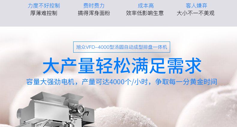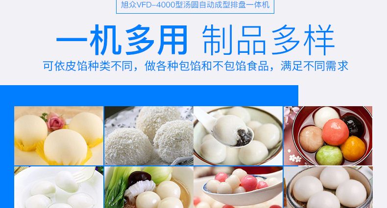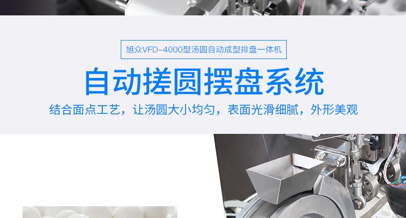 旭眾牌VFD-4000型湯圓自動成型排盤一體機是一款功能齊全、適用性廣的機器,可依外皮及餡料的各類不同,制作湯圓、豆沙包、南瓜餅、奶黃包、含餡饅頭、玉兔包等包餡食品。