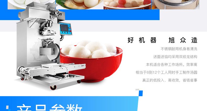 本機工作效率高,相當于8-12個工人同時手工制作湯圓,真正的低投入、高收效、省錢省工。本機對面粉質(zhì)量要求不高,適合各種工作場所。本機提供免費上門培訓指導、安裝、調(diào)試、面點工藝傳授。