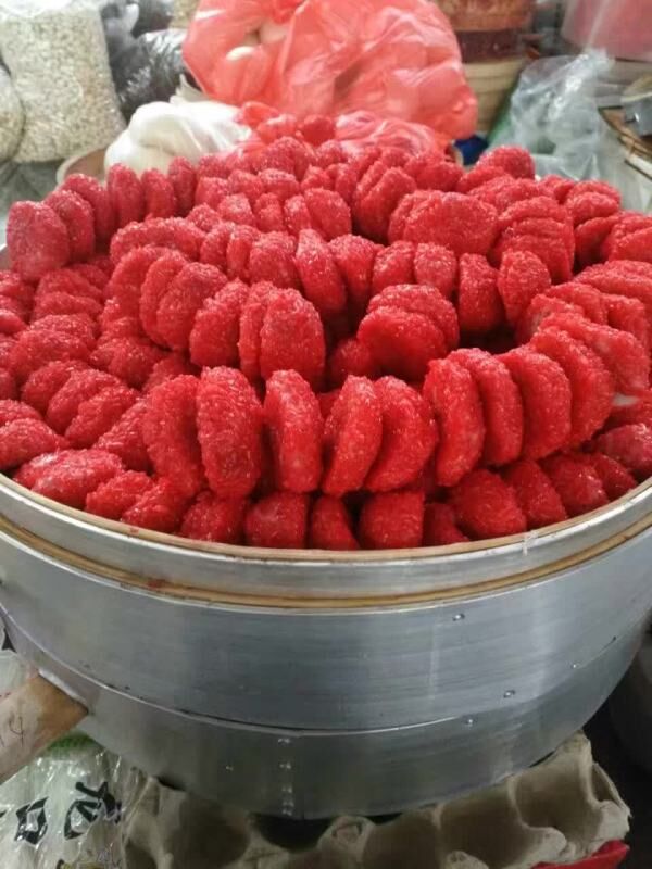 楊梅馃是用紅糖、芝麻等為餡的糯米粉團(tuán)子,外面粘上染紅的糯米蒸制而成,蒸熟后其外表鮮紅如楊梅,壁粘柔且餡香甜,里面還藏有略高于標(biāo)準(zhǔn)大氣壓的氣體,吃的時候偶爾會有“噗哧”聲。米粉點心以口感糯軟為好,所以“勾(兌)”米粉就有講究,它就是糯米粉與“早米粉”的搭配比例,如果糯米粉過多,雖然口感好但難以制作成“馃”。如果糯米粉過少,雖然制作容易但影響口感。