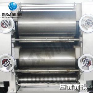 將攪拌好的面粉均勻的放進(jìn)去,面對輥將松散的面粉初壓成面皮,合皮部分有一對軋輥,它將兩層復(fù)合面皮合成一層,延軋部分由兩對軋輥組成,將面皮軋成所需的厚度,切條部分是將一定厚度的面皮切成所需寬度的面條,上門架部分把切斷后的面條自動挑起。